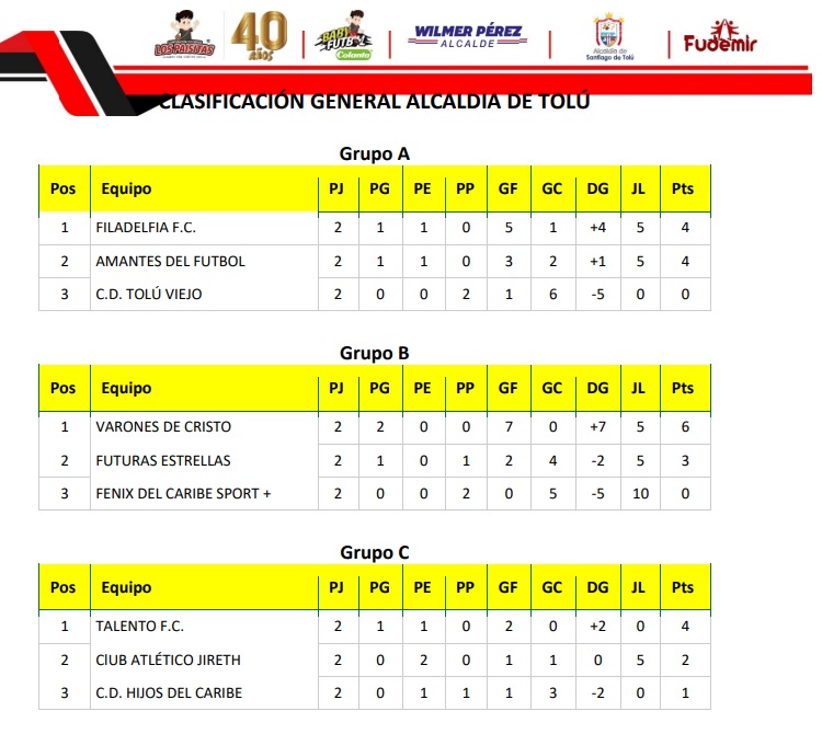 Ayer, Futuras Estrellas perdió 4-0 con Varones de Cristo. Goles: Milan Julio, Junior Herrera, Jesús Bedoya y Jael Sotomayor. Club Deportivo Toluviejo quedó sin goles ante Filadelfia, que ganó 4-0, con goles de Kleiton Berrio (2), Jeremías Pérez y Dilan Martín. La jornada finalizó con el empate 1-1 de Hijos del Caribe, gol de Aldemar Pérez, y Atlético Jireh, gol de José Mercado.